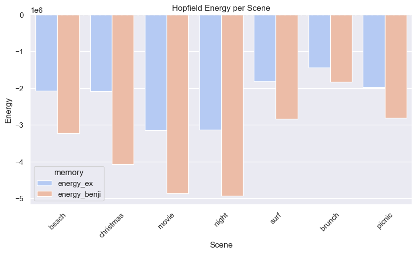 Think of energy as the depth of a memory basin. The lower the energy, the more stable the memory. The graph below shows the energy for each scene, comparing the ex basin to the Benji basin. Notice how in every case, Benji’s basin is deeper. This is the system creating new stability over time.