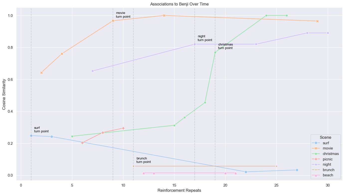 In the graph below, cosine similarity was used to calculate the model’s ability to recall the new association (i.e. the cartoon dog based on my real dog, Benji) instead of the ex association for each reinforcement run.